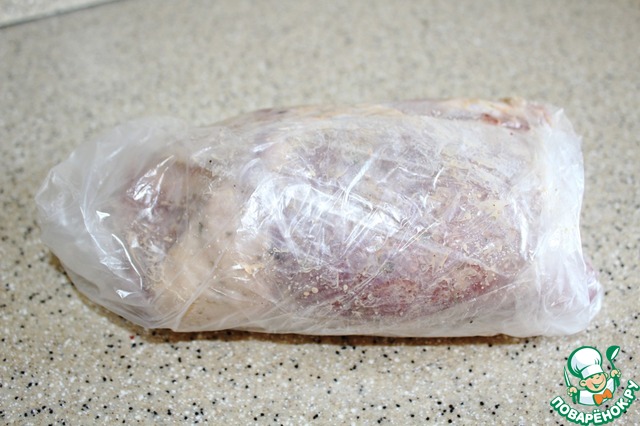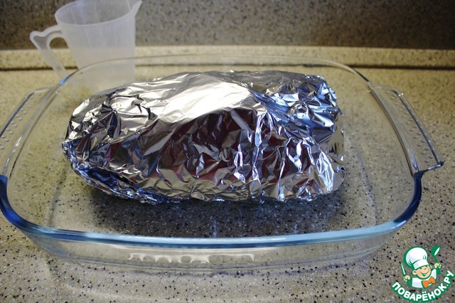Скатываем в рулет, скрепляем жгутами или зубочистками, заворачиваем в фольгу и укладываем в жаропрочную посуду. Туда же наливаем примерно 1-2 стакана воды, зависит от объема посуды и отправляем в нагретую до 200 град духовку на 2 часа. При необходимости воду надо будет подливать.