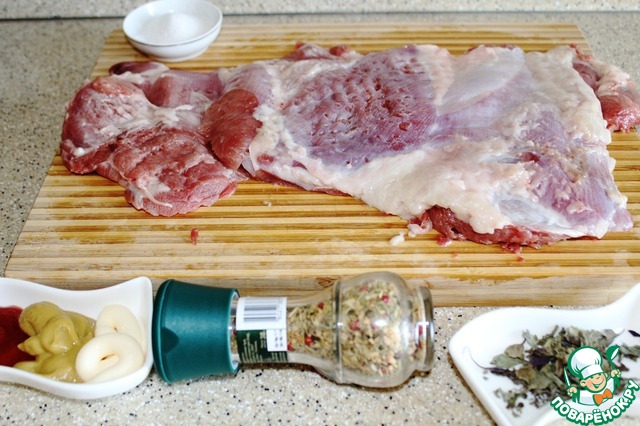 Мясо отбить до толщины куска 1 - 1,5 см, с двух сторон посолить, поперчить, приправить сухими специями, смазать маринадом (смешать майонез, горчицу и кетчуп).