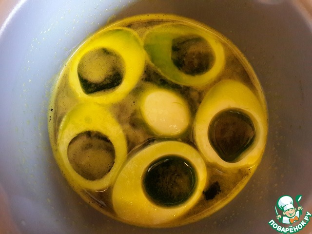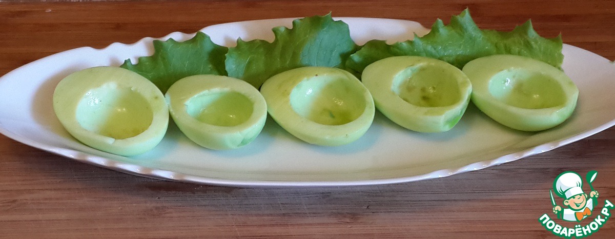 Яйца варим вкрутую, очищаем. Разрезаем вдоль. Желток удаляем, перекладываем его в отдельную тарелку. Шпинатный сок нагреваем почти до кипения. В горячий сок опускаем белки яиц и оставляем там на 1 час. Они окрасятся в бледно-салатовый цвет.
