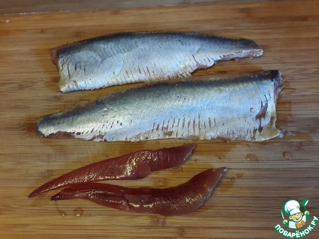 Если сельдь с икрой - то количество икры мойвы (минтая) можно сократить, или исключить вообще. А можно положить и ту и другую. Я так и сделала!