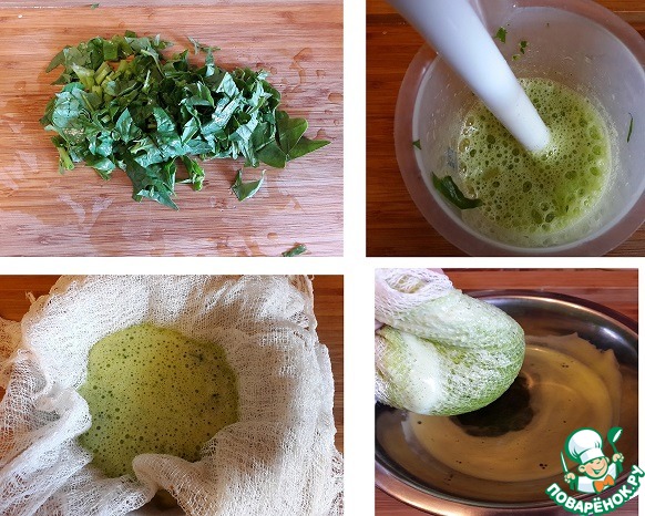 Шпинат мелко рубим, измельчаем блендером и выжимаем из него сок через сложенную вчетверо марлю