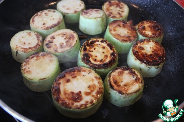 Обжариваем кабачки и шампиньоны. С запеченного перца и баклажана снимаем шкурку.