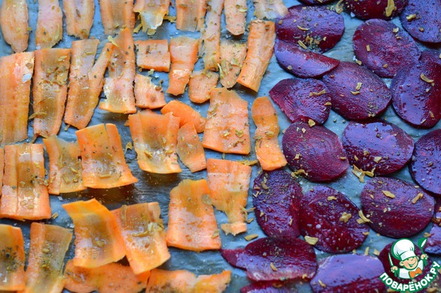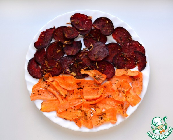 Приготовить овощные чипсы: свеклу, морковь, тонко порезать, уложить на противень, смазать растительным маслом при помощи кисти (чуть-чуть). Посыпать смесью из соли и приправ. Можно просто морской солью.