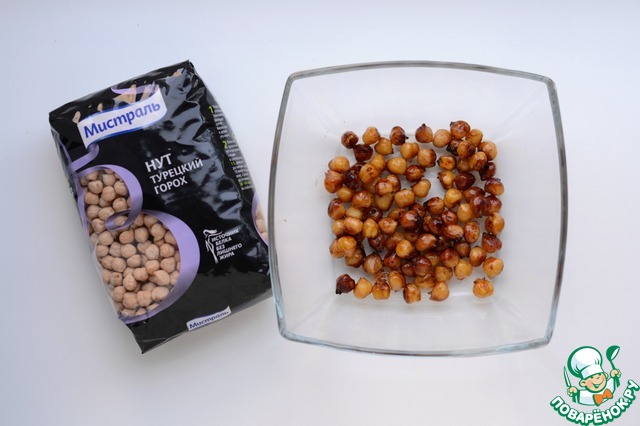 В сковороде прогреть оливковое масло, всыпать нут, немного обжарить, добавить мед, соль и лимонный сок. Помешать. Дать нуту карамелизоваться.