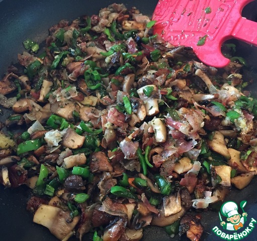 Сперва необходимо мелко нарезать нашу начинку: грибы, лук, перец и бекон и все это обжарить до готовности! Добавить мускатный орех, поперчить.