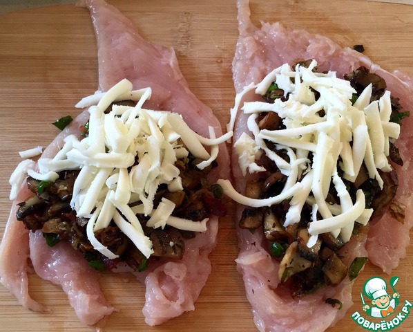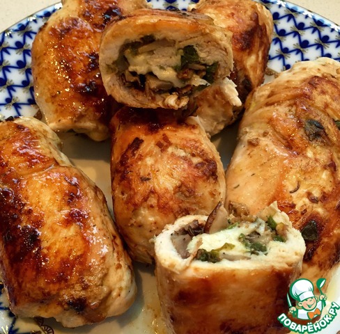 Куриные грудки разрезать ( каждую) вдоль и отбить, прикрыв пищевой пленкой, чтоб не разлетались куски по вашей кухне. В полученные плоские и тонкие куски куриной грудки положите немного начинки.