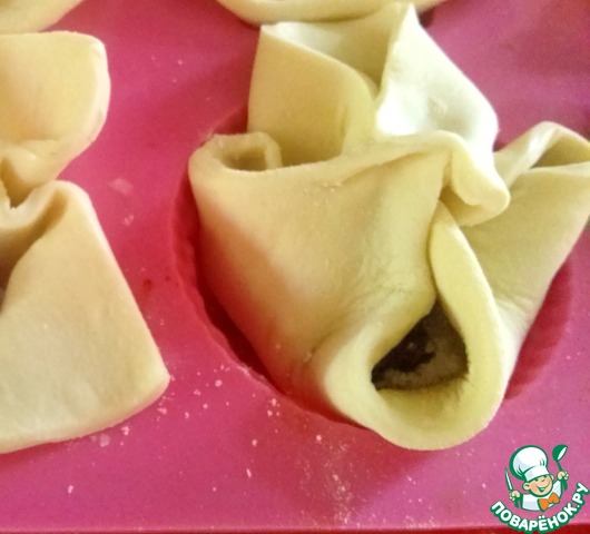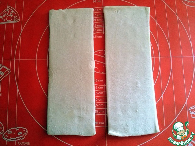 Разрезать каждый пласт на 6 квадратиков примерно 11х10 см. Если беспокоитесь, что начинка потечет, припылить каждый квадратик небольшим количеством крахмала.