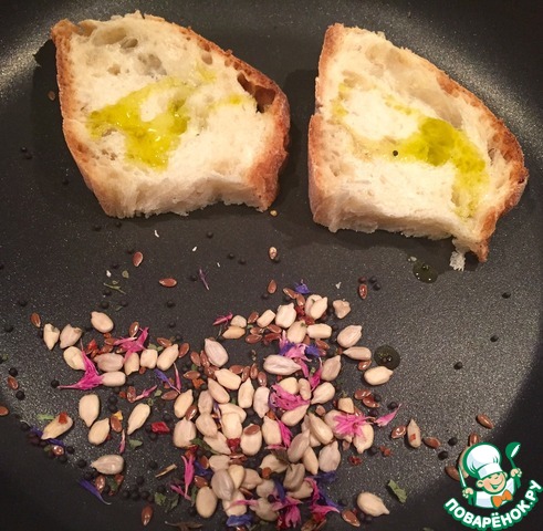 Тем временем поджарьте хлеб с оливковым маслом. Также обжарьте семена подсолнечника. У меня еще лавандовый цвет ( но это не обязательно)