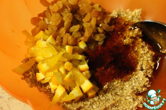 К вязкой банановой смеси добавить мед, изюм и мелко рубленный апельсин. Тщательно все перемешать и выложить в форму для запекания, застеленную пергаментом и смазанную 1 ч. л. растительного масла. Разровнять.