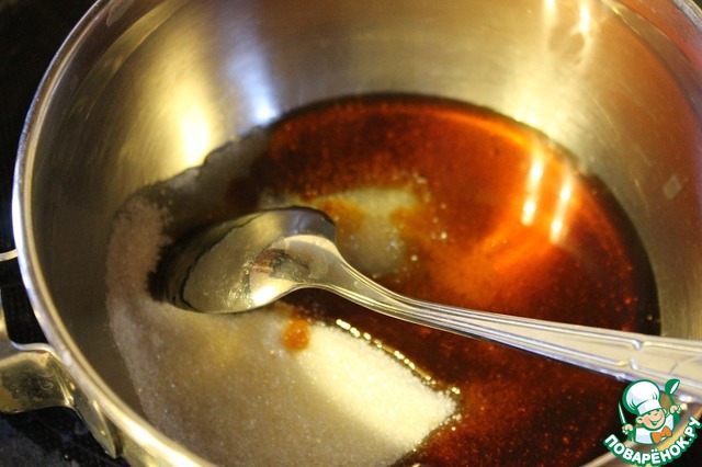 Сахар смешать с медом и растительным маслом. Поставить на медленный огонь и прогреть до растворения сахара, постоянно помешивая. НЕ КИПЯТИТЬ!