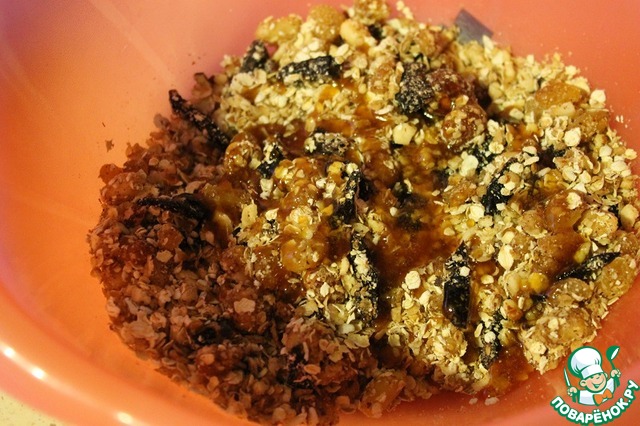 Добавить к ним фундук, изюм, чернослив нарезанный полосками и орешки в меде 1 ст. л.