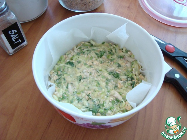 Перемешиваем, пробуем на соль и сахар. Форму застилаем пекарской бумагой и выливаем тесто.