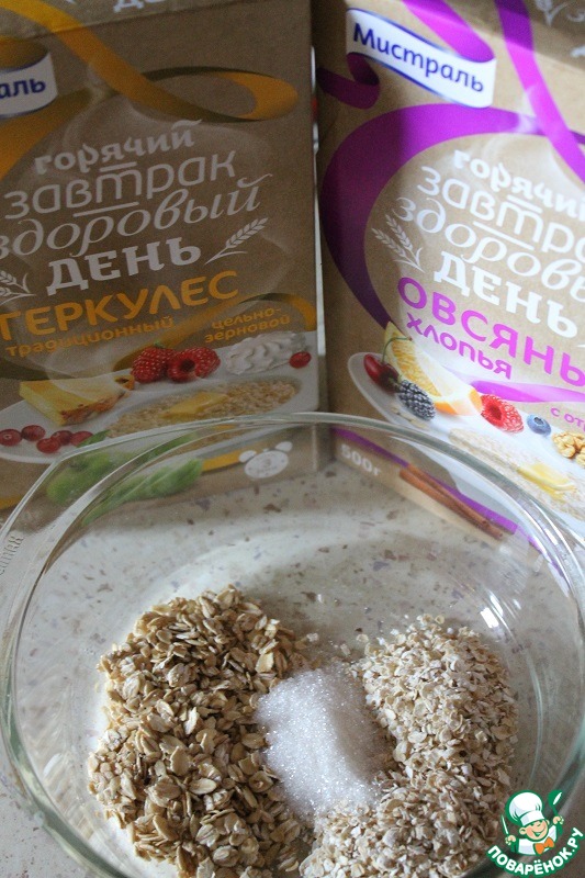 В стеклянную миску добавить сахар 1 ст. л., два вида хлопьев. Перемешать, залить молоком. Поставить в микроволновку на 3 минуты, при мощности 600 Ватт.