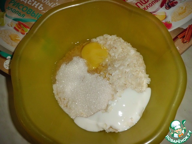Добавляем к ним яйцо, сахар и сметану. У меня сметана достаточно жидкая, если густая, то следует ее немного разбавить молоком или кефиром. Хлопья все должны быть пропитаны ею! Отставляем минут на 10.