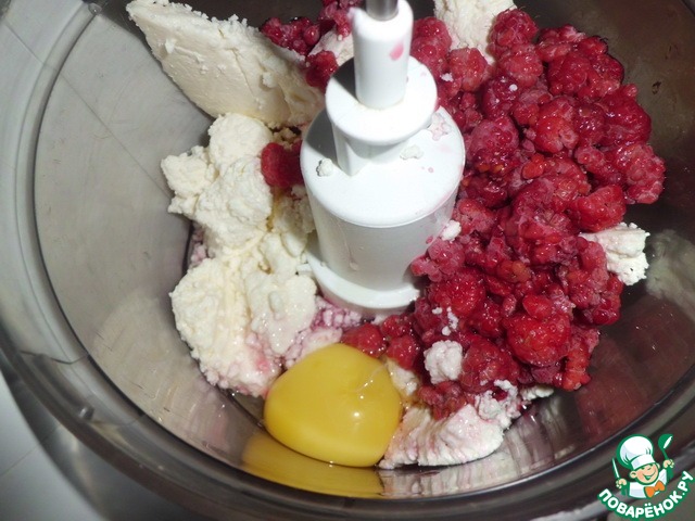 Творог перемалываем в комбайне с малиной, сахаром и яйцом.