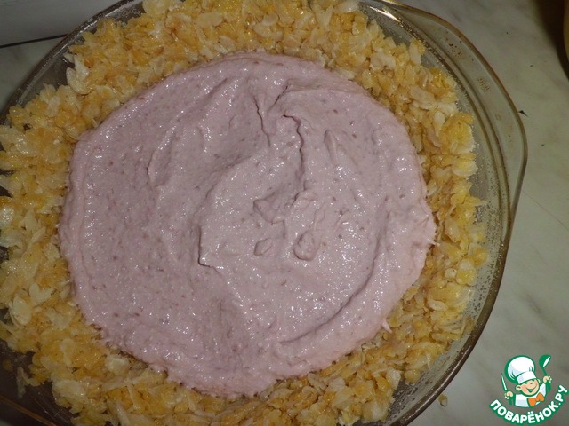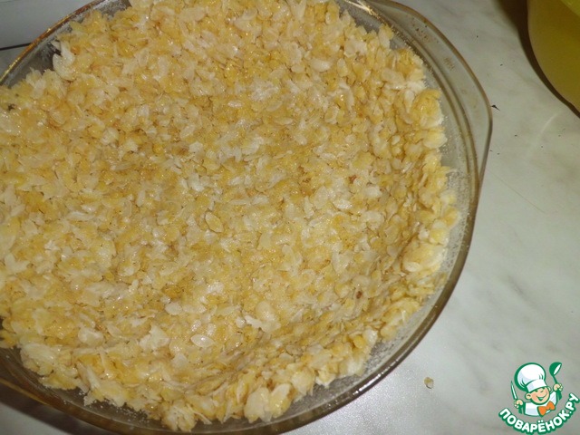 Форму смазываем сливочным маслом, посыпаем манной крупой. Выкладываем 2/3 части хлопьев. Распределяем по всей форме, не толстым слоем, формируем бортики (у меня форма высотой ок. 5 см.)
