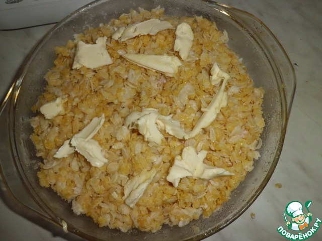 Закрываем оставшимися хлопьями и выкладываем несколько кусочков сливочного масла.