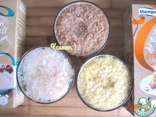 Духовку разогреваем t 160 градусов. Три вида хлопьев помещаем в разные тарелки и заливаем крутым кипятком.
