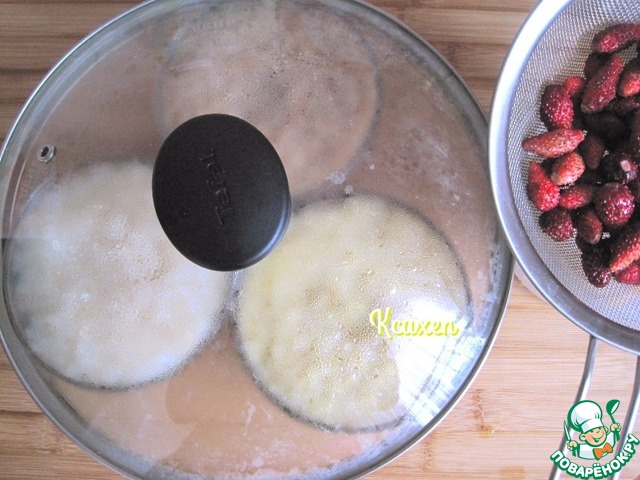 Накрываем хлопья и оставляем на 3 минуты. Землянику промываем и обсушиваем. Отдельно сливки прогреваем с добавлением сахара, помешивая, пока сахар не растворится.