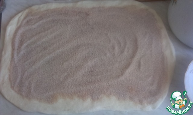 Раскатываем корж в ширину 1 см, смачиваем снаружи водичкой и распространяем по нему сахарно-коричную смесь.
