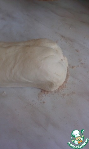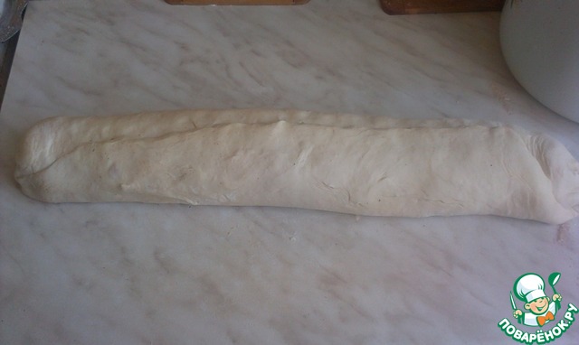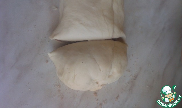 Замыкаем образовавшуюся открытой сторону рулета, а получившуюся булочку отправляем на смазанный маслом противень.