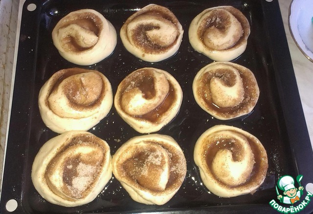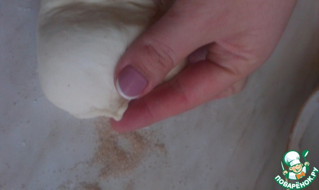 Приготовьте корицу, смешанную с сахаром, четверть стакана сахара оставьте и растворите в четверти стакана горячей воды (для смазки булочек).
