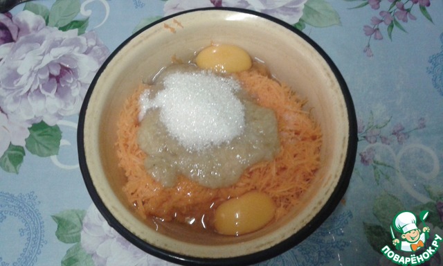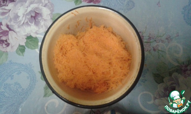 Морковь натираем на мелкой тёрке и кладём в глубокую посуду.