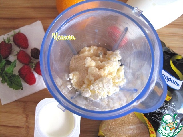 В чашу блендера кладём творог, йогурт, молоко и тростниковый сахар ТМ Мистраль. Взбиваем несколько секунд до однородности.