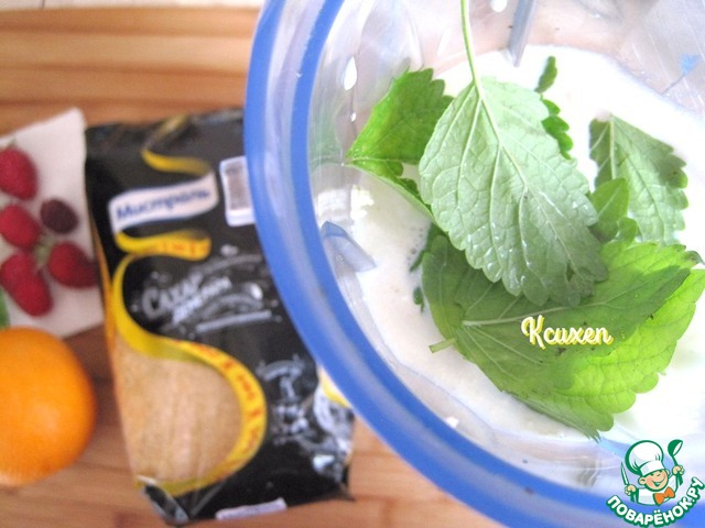 С мяты снимаем листочки, из половинки апельсина выжимаем сок. Добавляем апельсиновый сок и мяту в блендер к молочно-творожной смеси и снова всё взбиваем до измельчения мяты.