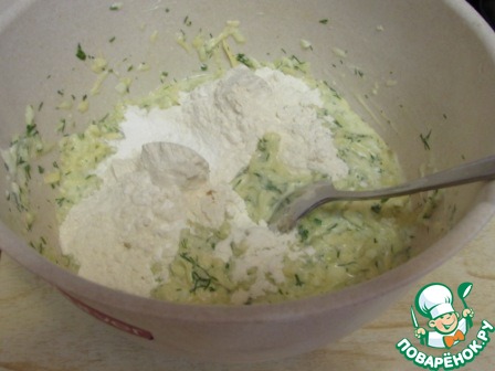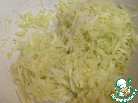 Кабачок натереть на крупной терке, посолить и оставить на 5 минут. Затем отжать.