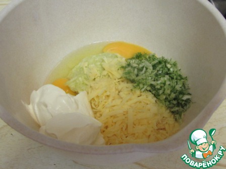 К отжатому кабачку добавить сыр, яйца, сметану и пропущенный через пресс чеснок, перемешать.