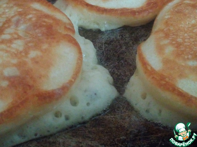 Совет: оставляйте верхнее тесто на оладушке сырым - не ждите когда он пропечется насквозь. Сразу переворачивайте, как только подрумянится нижняя сторона - тогда они получатся более пышные.