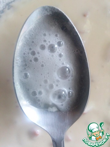 Хорошо перемешиваем тесто и добавляем в него соду, гашеную уксусом. Аккуратно вмешивайте эту жидкость в тесто.