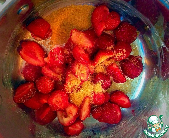 Если клубника крупная, то можно порезать ее на половинки. Выкладываем ее в сотейник или кастрюлю с толстым дном. Засыпаем 2 ст. л. коричневого сахара и отправляем на средний огонь. Наша цель дождаться полного растворения сахара. Клубнику лучше не мешать иначе получится клубничная каша, а нам нужна клубника в соусе.