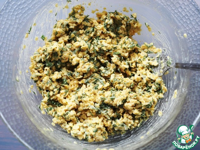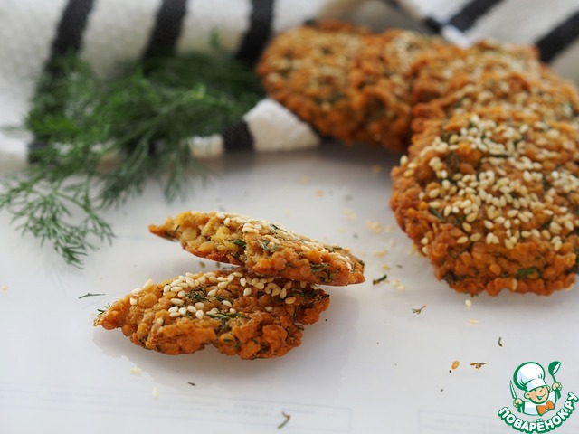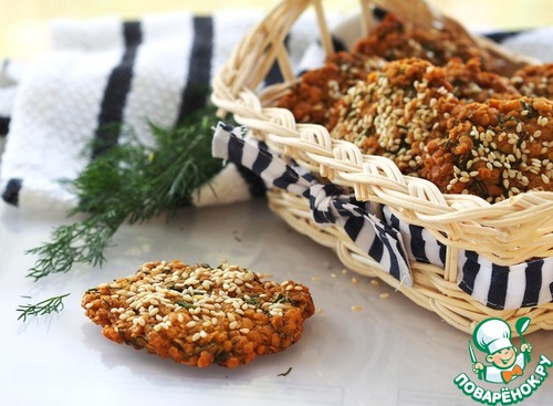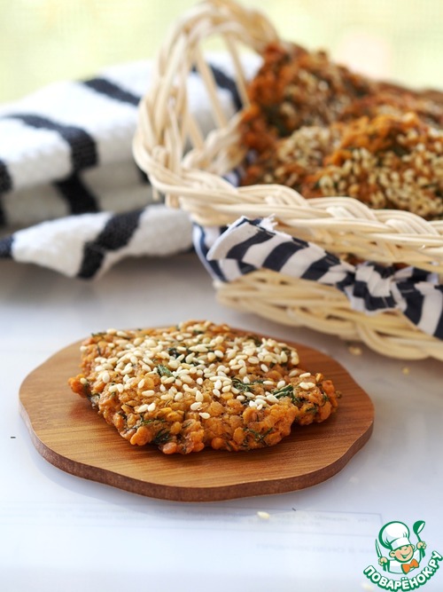 Включить духовку на 175 градусов. Противень застелить бумагой для выпечки, очень хорошо смазать растительным маслом и выложить на него лепешки из смеси. Я их формировала руками, т. к. смесь получилась достаточно густая,- всего вышло 9 штук. Сверху посыпать кунжутом.