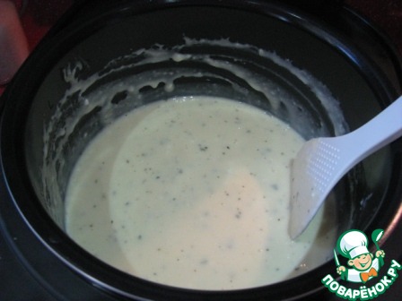 Получившуюся массу выложить в чашу мультиварки, закрыть крышку. Нажать кнопку "Меню". Установить программу "Мультиповар", время приготовления установить 7 минут, температуру установить 100*. Когда начнется обратный отсчет (или функция подогрев), открыть крышку и при постоянном помешивании довести массу до однородной консистенции. Держать помешивая 7 минут. Готовую массу перелить в отдельную емкость и дать остыть.