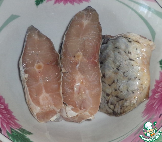Кусочки карпа тщательно промыть водой, обтереть солью и душистым перцем.