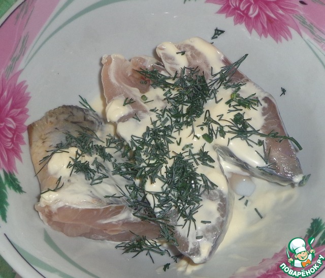 Добавляем мелко порезанный укроп и перемешиваем. Оставляем рыбу мариноваться на 4-5 часов.