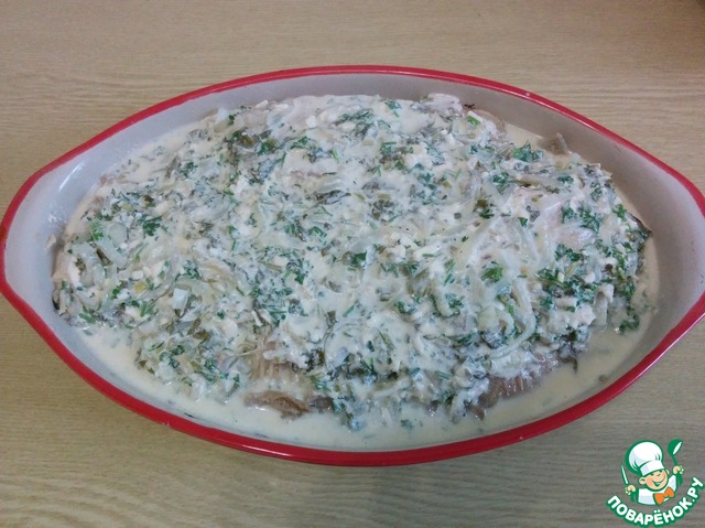 Теперь приготовим соус (простите, пошагово сфотографировать не удалось, так как все ингредиенты кладуться практически одновременно). Со сковороды, в которой Вы тушили рыбку, слить жидкость, влить немного растительного масла и обжарить в нем луковицу, нарезанную четверть-кольцами до золотистого цвета. К луку добавляем сметанку, разводим ее водичкой (примерно 0,5 л) так, чтобы получилось жостаточно жидкая консистенция, перемешиваем. Сразу добавляем мелко нарезаный щавель, тертый плавленый сырок, солим, перчим, перемешиваем накрываем крышкой. Доводим наш соус до кипения и сразу выключаем.