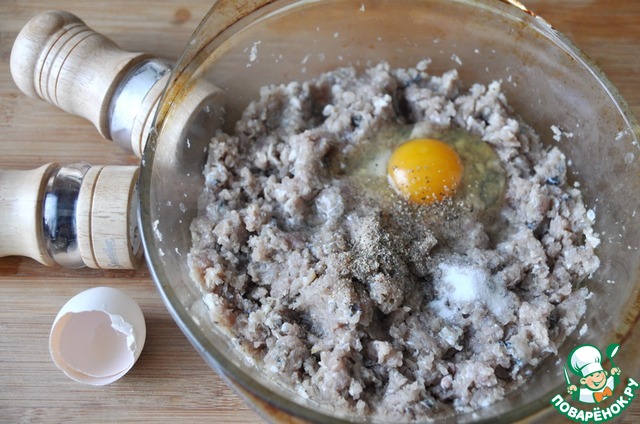 К рыбному фаршу добавляем яйцо, соль, смесь перцев. Перемешиваем.