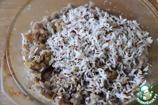 Добавляем остывший рис с киноа, хорошо перемешиваем.