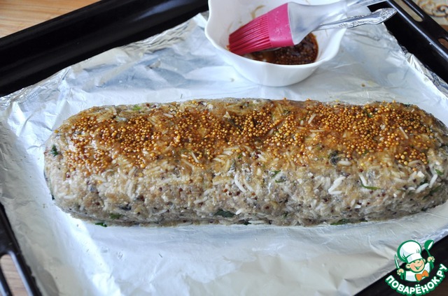 Смешиваем горчицу с зёрнами и соевый соус, покрываем этой смесью рулет. Ставим в нагретую до 220 градусов духовку для запекания на 30-40 минут.