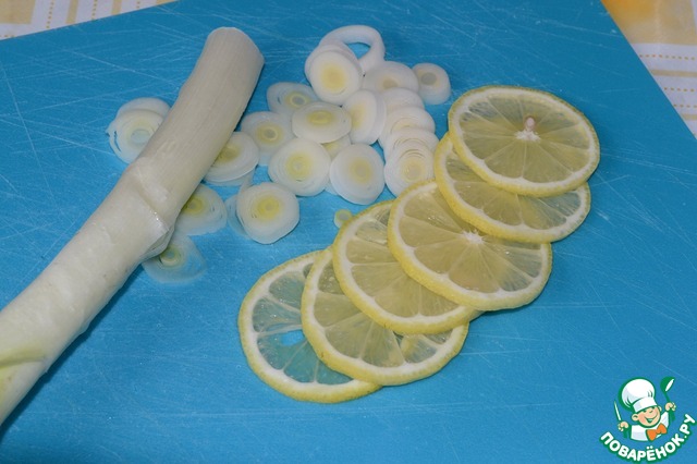 Надрезать карасей с одной стороны (можно с двух). Вложить внутрь дольки лимона и несколько колец лука порея. Оставить еще на 10 минут.
