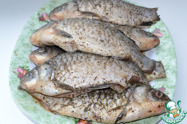 Черный перец, укроп, соль и базилик перемешать. Натереть хорошенько данной смесью карасей снаружи и внутри.