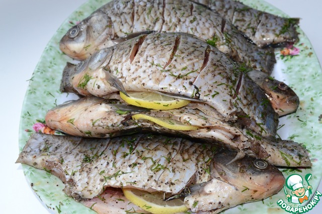 Жарить на решетке над горячими углями 10-15 минут с двух сторон. Сбрызнуть лимонным соком. Можно караси предварительно завернуть в фольгу.