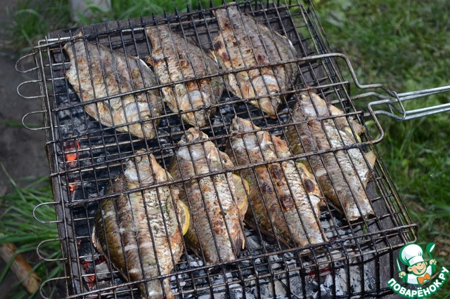 | Ездили мы на рыбалку, наловили карасей. Часть карасиков пошли на уху, а остальных решили запечь с дымком на свежем воздухе. Вкусно! Готовить рыбу на мангале одно удовольствие, просто и быстро. |