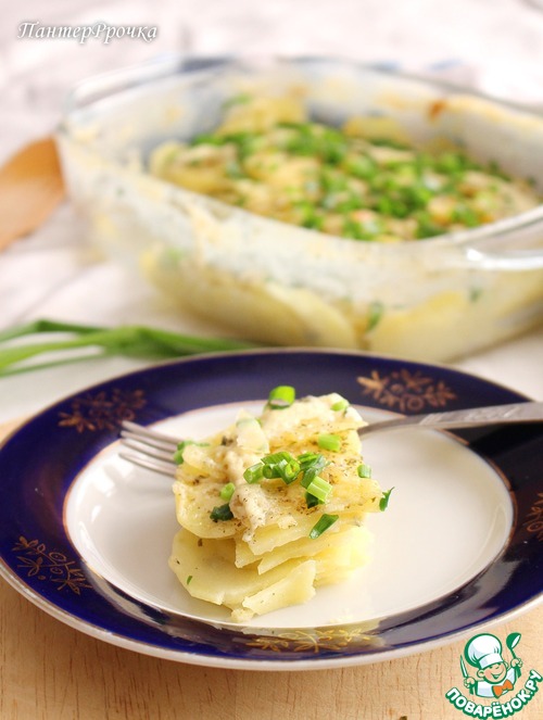 Накрыть крышкой (обязательно, чтобы картофель не подсыхал) и готовить в СВЧ при мощности 1000 Вт 10-13 минут. Картофель должен быть мягким, а молоко - выкипеть. Сверху посыпать нарезанным зеленым луком.