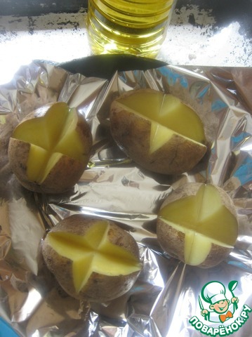 Выкладываем на фольгу в форму для запекания (можете смазать картофель растительным маслом) и отправляем в духоку минут на 20