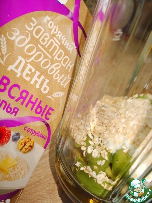 Положить в чашу блендера, добавить йогурт, сок, мед и овсяные хлопья с отрубями. Взбить до однородности.