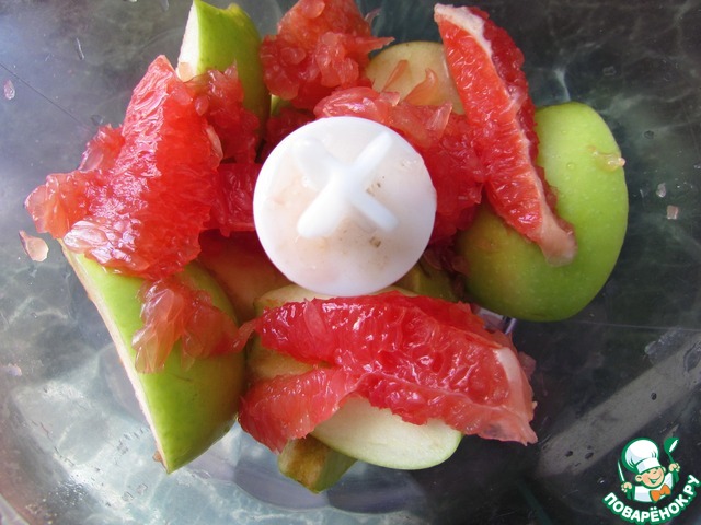 Грейпфрут нарезать кусочками, избавляясь от косточек и перегородок. Влить яблочный сок